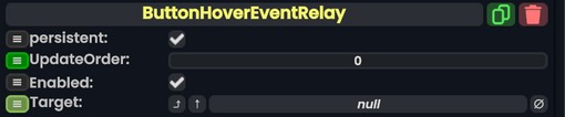 The ButtonHoverEventRelay component takes in a slot target, and if any IButton hover event happens with this component on a slot, will also send a signal to that target slot, and the components on that target slot will trigger with hover events (if applicable).