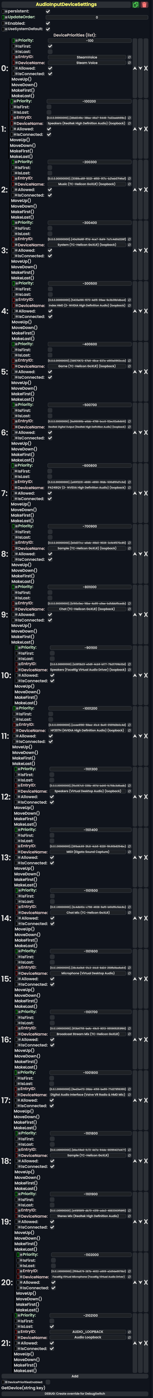 The AudioInputDeviceSettings Component is used to set the priority order of input devices for the local user. It also can be used to disable priority and use the system default instead.