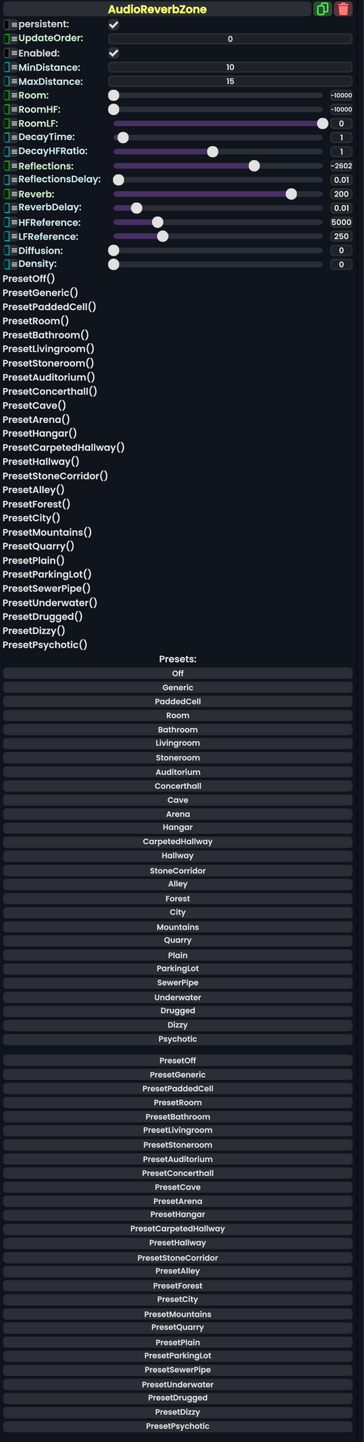 Float | the minimum distance that this will affect audio sources from its slot position in global space. Below this distance audio sources will be 100% affected by this reverb zone. |