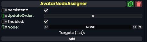 The AvatarNodeAssigner component only functions on an avatar being equipped or de-equipped by a user. When equipped, the component finds the first Component:AvatarObjectSlot with a body node value that equals Node. if found, it assigns all slot storage fields in Targets to the slot the Component:AvatarObjectSlot is on. When de-equipped, all slot storage fields in Targets have their stored slot cleared.