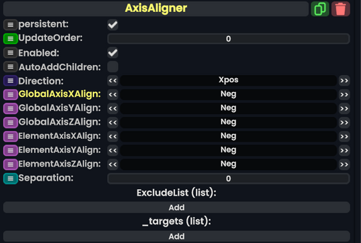 The AxisAligner component is used to Align elements along a single line axis in local space under a slot based on their Bounding boxes. It also allows for excluding bounded elements from calculations, and for aligning elements themselves so that they can be centered like varied sized beads on a string or like boxes into the corner edge between a wall and floor. These calculations are heavy, and this component is best used lightly. Remove this component after using it to Align world elements, as it will be constantly active and will behave violently if used to Align shelves for example in a world and left unremoved.