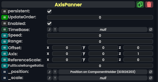The AxisPanner component is used to move an object along a single axis linearly. This component can affect position and scale.