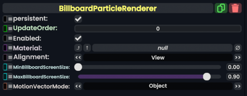 The BillboardParticleRenderer component is a rendering style component for Particle systems that give them the default square tile based particles.