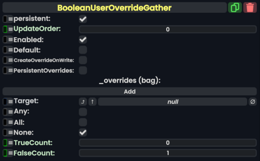 The BooleanUserOverrideGather Component allows storing Boolean "override" values for each user listed under _overrides and driving the Target field. The behavior is similar to ValueUserOverride<Bool>, except this component also reports aggregate information about the overrides.