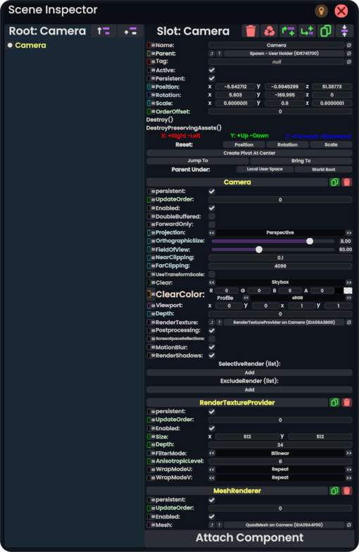 Put the component onto a slot, and position the slot. The produced image can either be accesed through a RenderTextureProvider component or by creating a Texture2D asset using the Render To Texture Asset Protoflux node.