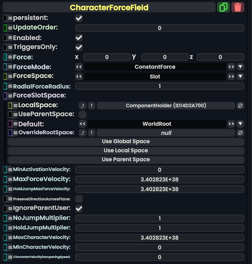 ForceSpace CharacterForceField.Space Whether to do the force direction in local or global space (so should Force be scaled and rotated by the slot this is on or not?)