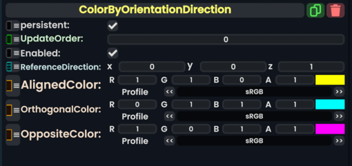 The ColorByOrientationDirection component is used to make particles change color depending on their dot product of their orientation to a reference orientation. Dot product essentially means how close in terms of angle is one direction to another. The colors when in-between are lerped.