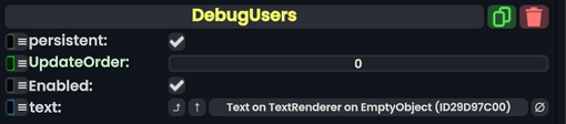 The DebugUsers component drives get contents of a string field to show statistics of each user in the current world.