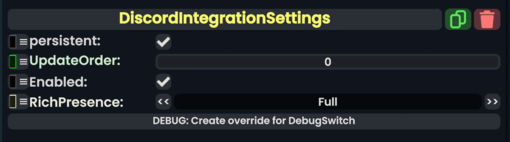 The DiscordIntegrationSettings component handles discord rich presence info communicated from Resonite. This is interacted with via the Settings system.