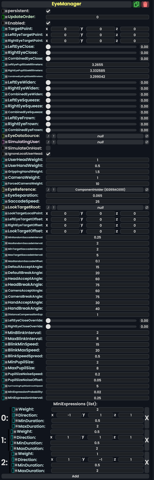 The Eye Manager Component is a component that is used for configuring the Eyes of an avatar, Both supporting simulated eye-movement, and real eye tracking using a headset with built in eye tracking sensors such as the HTC Vive pro eye.