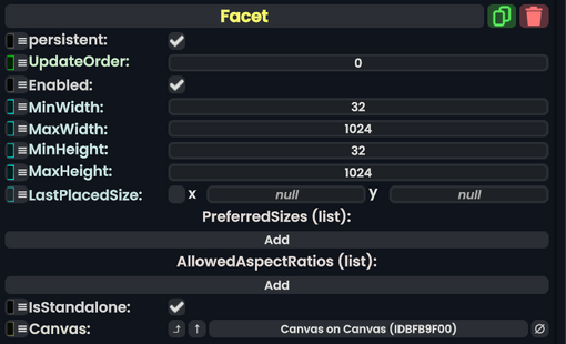 The Facet Component is the component that drives every user made facet in the game. This component specifically handles the sizes in which a facet can/can't, and prefers to be placed. It also reports the last size a facet was placed, the aspect ratio sizes it can be placed, and the Canvas that makes up the facet's contents.