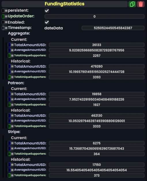The Funding Statistics component is used to get the different funding values for Resonite in United States Dollars from supporters.