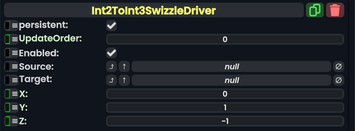 Int 2To Int 3Swizzle Driver component as seen in the Scene Inspector