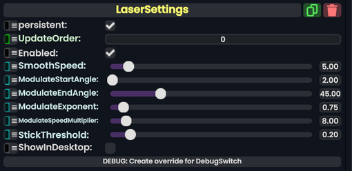 The laser smoothing speed will be multiplied by this value once you have reached the modulate end angle. Increasing this value will make the laser catch up quicker once you move your hand far enough. Lowering the value will make it take longer to catch up.