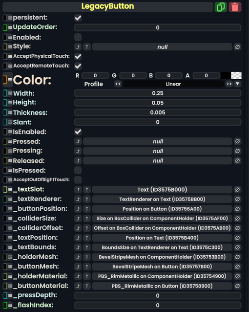 Add to an empty slot to automatically create materials, meshes & colliders on the slot this was added to and 2 (automatically created) child slots. From there it will act like any other button component.