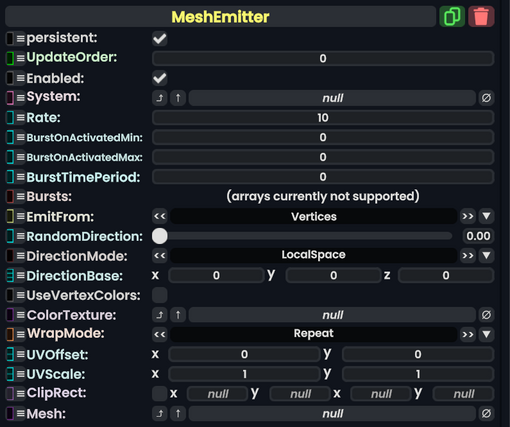 MeshEmitterDirection | How to determine the emission direction of particles emitted from this mesh. |
