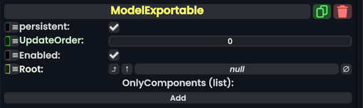 The ModelExportable component is used to mark a slot hierarchy as a model that can be exported to a user's local machine. This will export static and skinned meshes, but is subject to the same restrictions normal model exporting has.