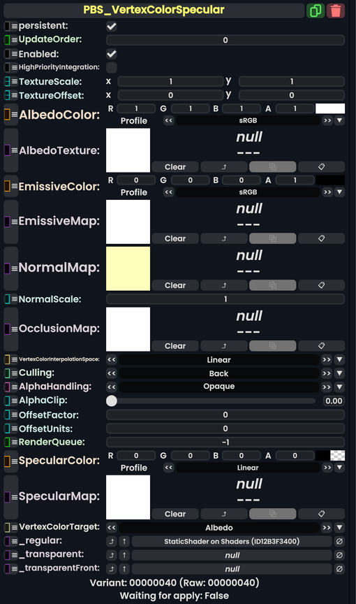 The PBS_VertexColorSpecular component is a Component:PBS_Specular component except that it allows for the use of vertex colors as a multiplier for different colors/properties of the material.