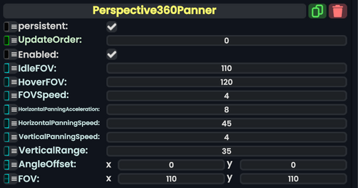 The Perspective360Panner component allows for moving or panning across 360 degrees around a view, given the parameters of how this panning should work. This is mostly seen in the WorldListFacetPreset component, where each listed item has this component to allow looking around in the world preview thumbnails.