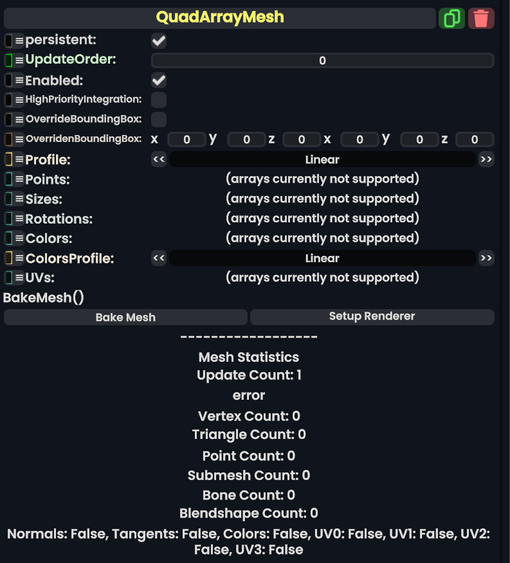 Quad array mesh makes a bunch of quads with defined positions, rotations, vertex colors, and UV coordinates which are rendered as one mesh. This is made from Quad brushes which can be found in the resonite essentials folder.