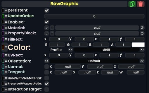 The RawGraphic component takes in a Material or a Material Property Block component, then shows the raw graphic image onto the UIX.