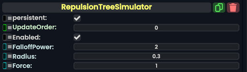 The RepulsionTreeSimulator can be used alongside the RepulsionTreeItem component on it's children slots to create a repulsion tree simulation. A repulsion tree is a simulation that keeps a bunch of RepulsionTreeItems on the outside shell of a sphere. The different slots of the tree will move around as they push or pull each other in real time.