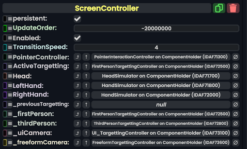 Screen Controller component as seen in the Scene Inspector