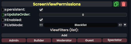 The ScreenViewPermissions component is a Permissions type component that can apply rules for what certain roles in a session can do with views like third person, free cam, or UI targetting.
