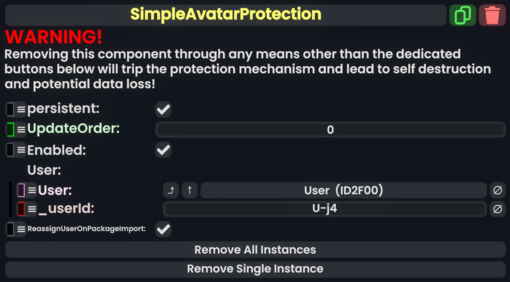 All instances of SimpleAvatarProtection on an avatar can be removed by its owner by clicking the "Remove All Instances" button. No other user can remove the component. This is useful if you are trying to clear protection from an avatar, but cannot remember where the component was; you can simply add another instance and remove them all at once.