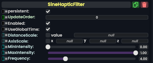 The SineHapticFilter component is used to make haptics triggered by Components on the same slot change in intensity over time like its riding waves.