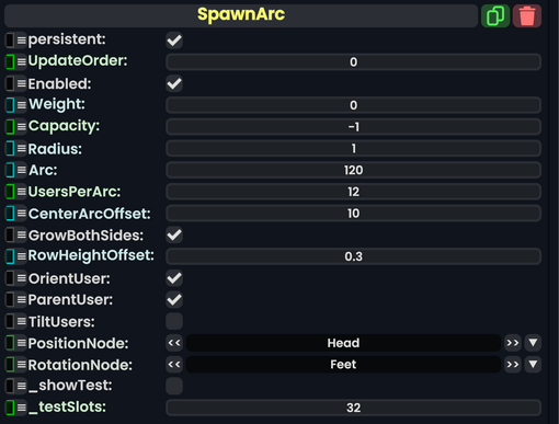 The SpawnArc component spawns in users along the arc of a circle, with an optional weight to select this spawner.