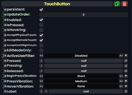 The TouchButton component is used to make a physical button with no press depth that is instantly pressable upon click or touch. For a button with press depth, please see PhysicalButton.