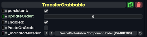 Transfer Grabbable is a component that is used to mark objects that undergo Transfer grabbing, but only while in Userspace. The grabber during this process saves the object into memory including materials, then simulates a paste as it puts the object into the target world.