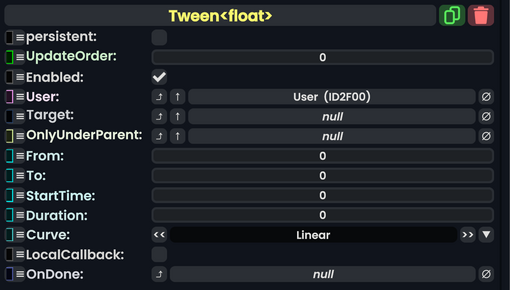 The Tween component is usually auto generated by ProtoFlux or by holding an object and hitting primary to align the object. The purpose of this component is to handle transitions in a value to value manner and only exists temporarily. This is not used for animations, only for a transition from one value to another. For animations, see either Component:ValueGradientDriver or Component:Animator