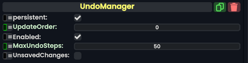 The UndoManager component keeps track of all user's actions in the world, allowing users to Undo or revert back to a previous step or action. Undoing can be controlled in ProtoFlux within the Undo Category, where users create undo batches and steps that this component can utilize. Undoing can be disabled by setting max steps to 0.