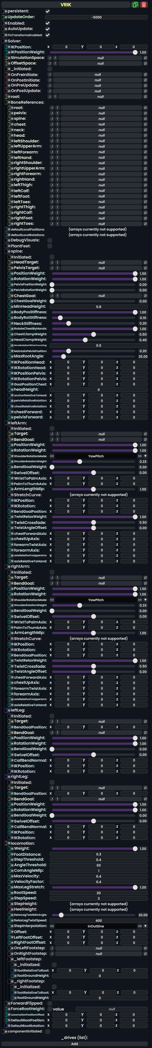 AutoUpdate Bool Whether to update the VRIK regardless of whether or not the sync delegates are called by a VRIK avatar or similar sources. this can break systems still using a VRIKAvatar but can fix ones with a lack of such component.