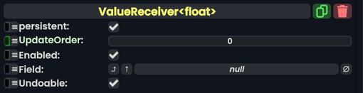 The ValueReceiver component is used in UIX elements to allow dropping a value property into a Component:Button or interactable UIX section to change a value field to the dropped value.