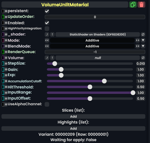 The VolumeUnlitMaterial component is used to display 3D Textures like Xrays, sunbeams, MRIs, CT scans, or any other 3D texture in a volumetric 3D cube that can optionally be sliced. Can also be used for volumetric lighting, but high texture resolutions can be large and cause considerable render lag.