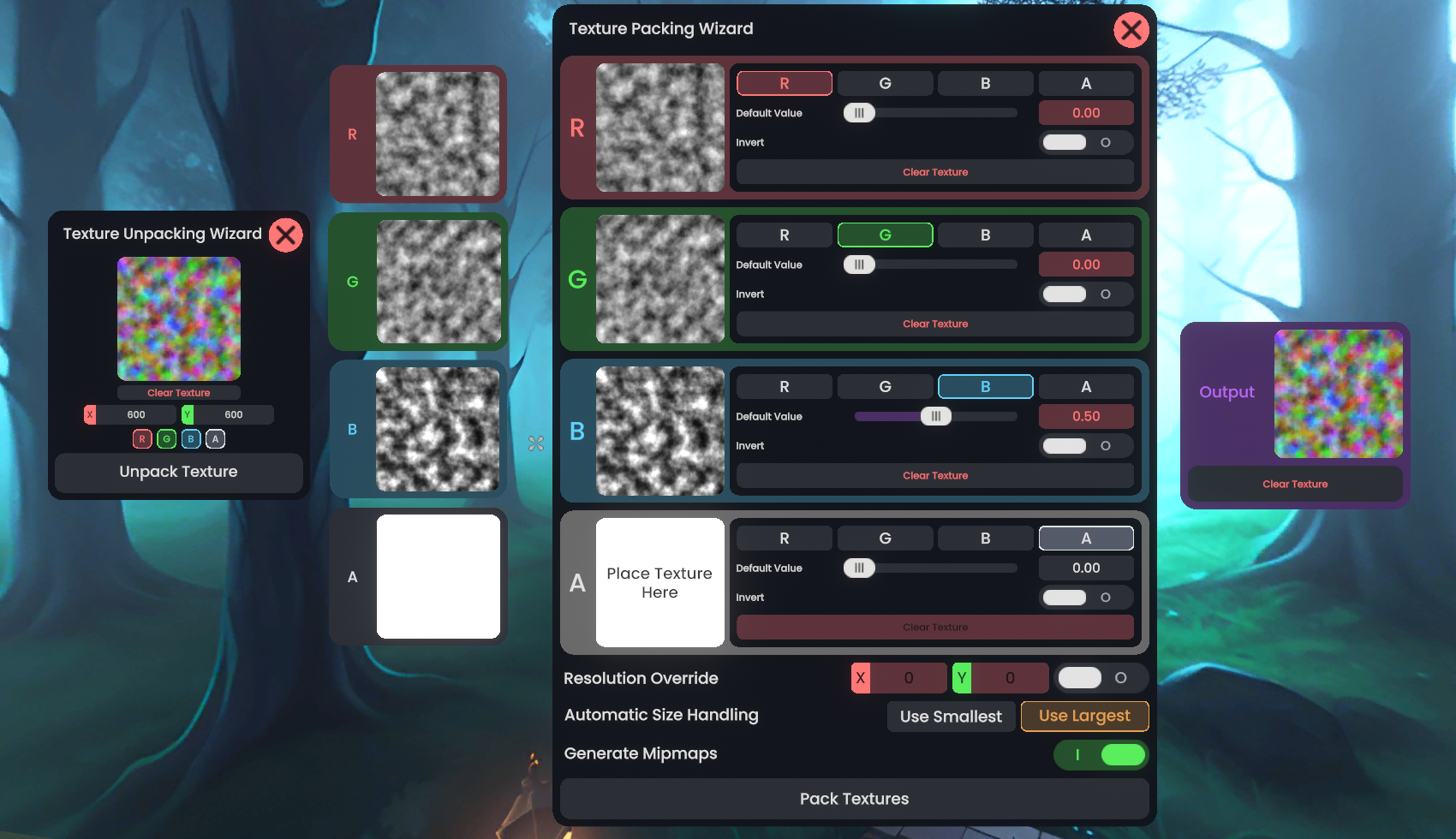 The Texture Unpacking Wizard unpacking an RGB Texture into separate Red, Green & Blue channels | The Texture Packing Wizard packing the separate noise textures into a single RGB texture
