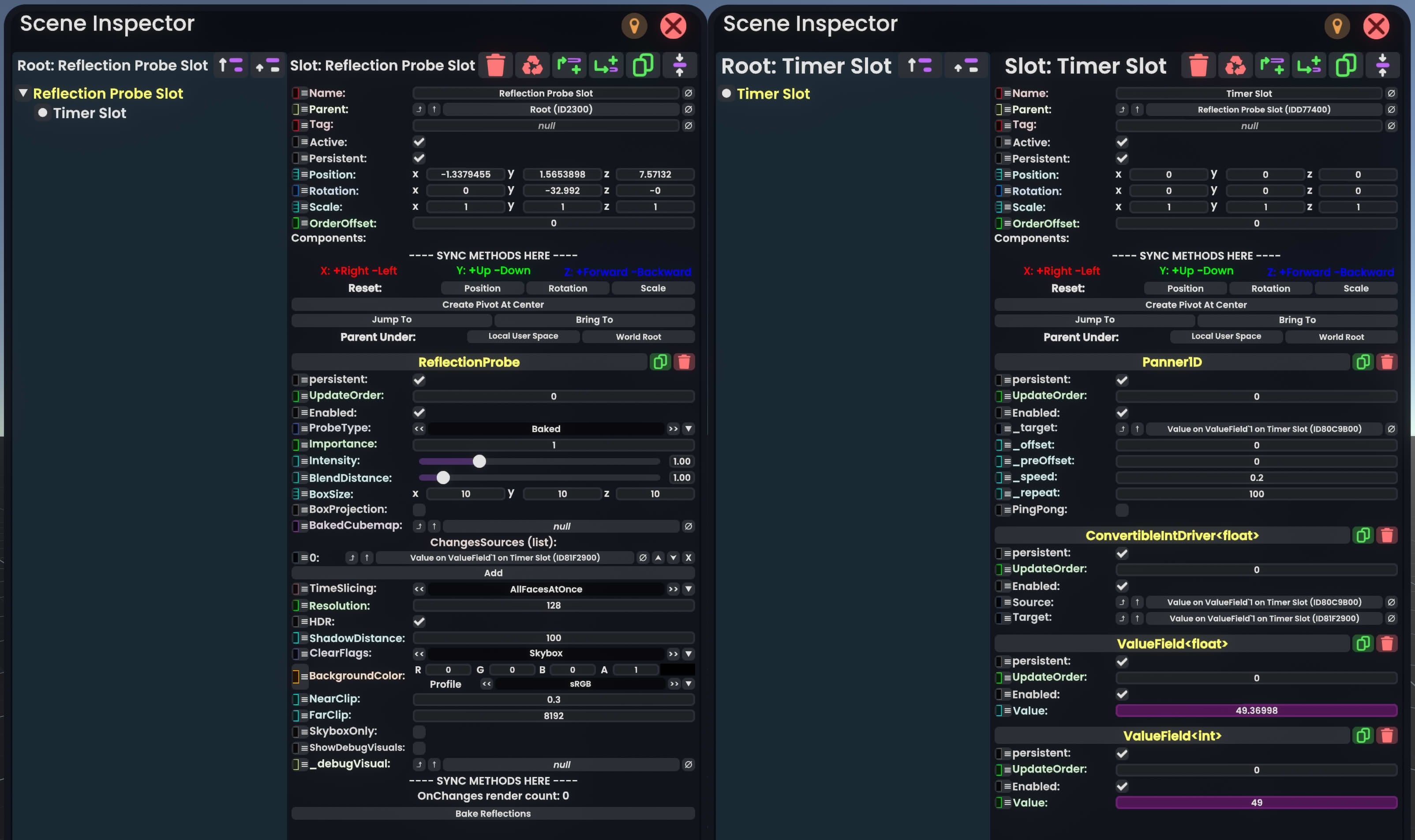 A setup to cause a reflection probe to update every 5 seconds for subtly changing reflection probes.