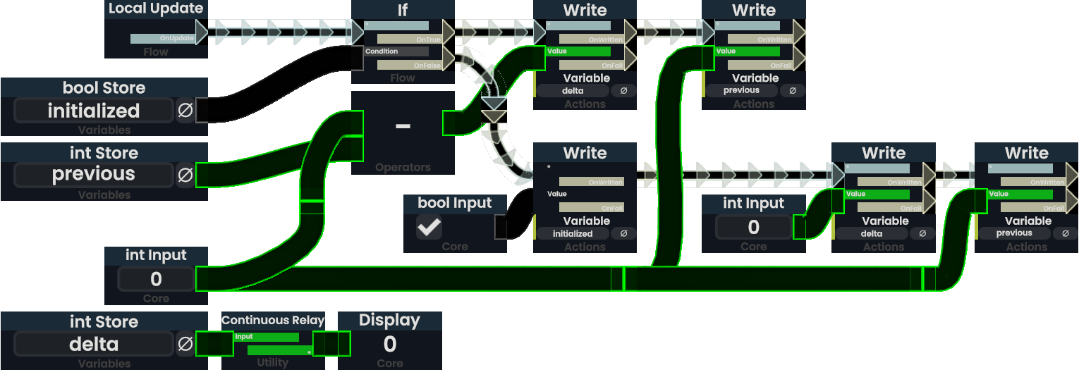 In this case, the leftmost Input Node represents the node's input and the Display its output. This implementation of an int Delta Node is equivalent to the implementation in the game's code. How exactly the difference to the previous value is calculated depends on the value type.