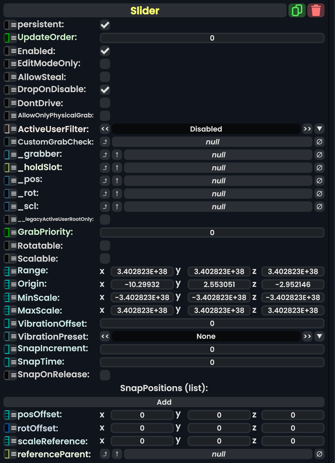 21:32, 30 March 2024 SliderComponent.png (file) 343 KB This image has the new Resonite inspector style and had been uploaded for the wrong component. (UIX slider) 2