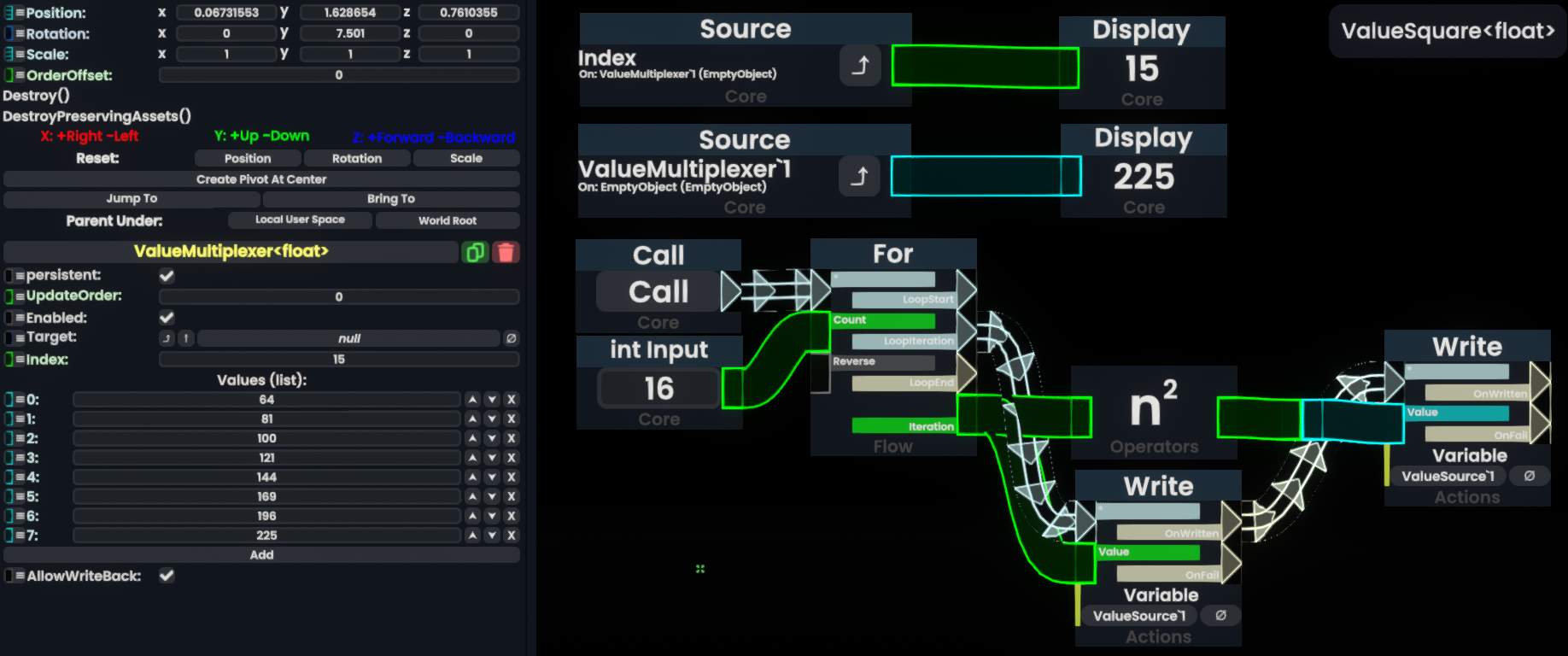 16:45, 1 December 2024 Protoflux example DynamicImpulse Value.webp (file) 233 KB "Changing Value" is a 2 initially and evaluated once to be used as a payload for a dynamic impulse. The value is only available while the receiver's OnTriggered impulse is executed. (see variables "Value A" and "Value B") <br/>Changes to the trigger's input are not reflected. (Increments of "Changing Value" did not affect impulse's payload.) 1