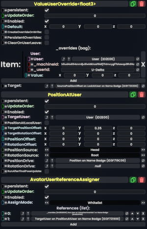 For this to work, a user has to create a Name Badge slot on their avatar with the correct components that overrides the auto-generated one on loading. This new Name Badge is specific to the avatar, so any user equipping that avatar will have that custom name name badge. This allows name badges to be customised for each avatar but also may cause confusion if the components generating the name part don't change with the user and it is given to someone else.