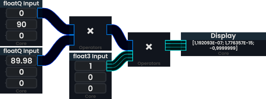 The above Protoflux is rotating a Float3 vector 90° counter-clockwise around the Y-axis using a FloatQ. This transforms a vector facing towards +X into one towards -Z. Note that the X-component of the output vector is written in scientific notation representing 0.00000005960464. This very small number is the result of precision errors.