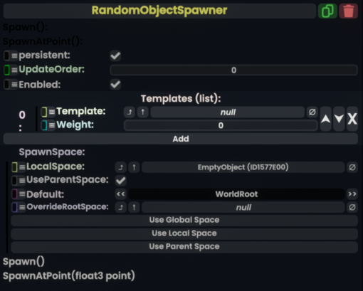 The SpawnData type is used in the RandomObjectSpawner component to provide a mapping between a template slot, and a weight that influences the likelihood of a particular template slot being spawned.
