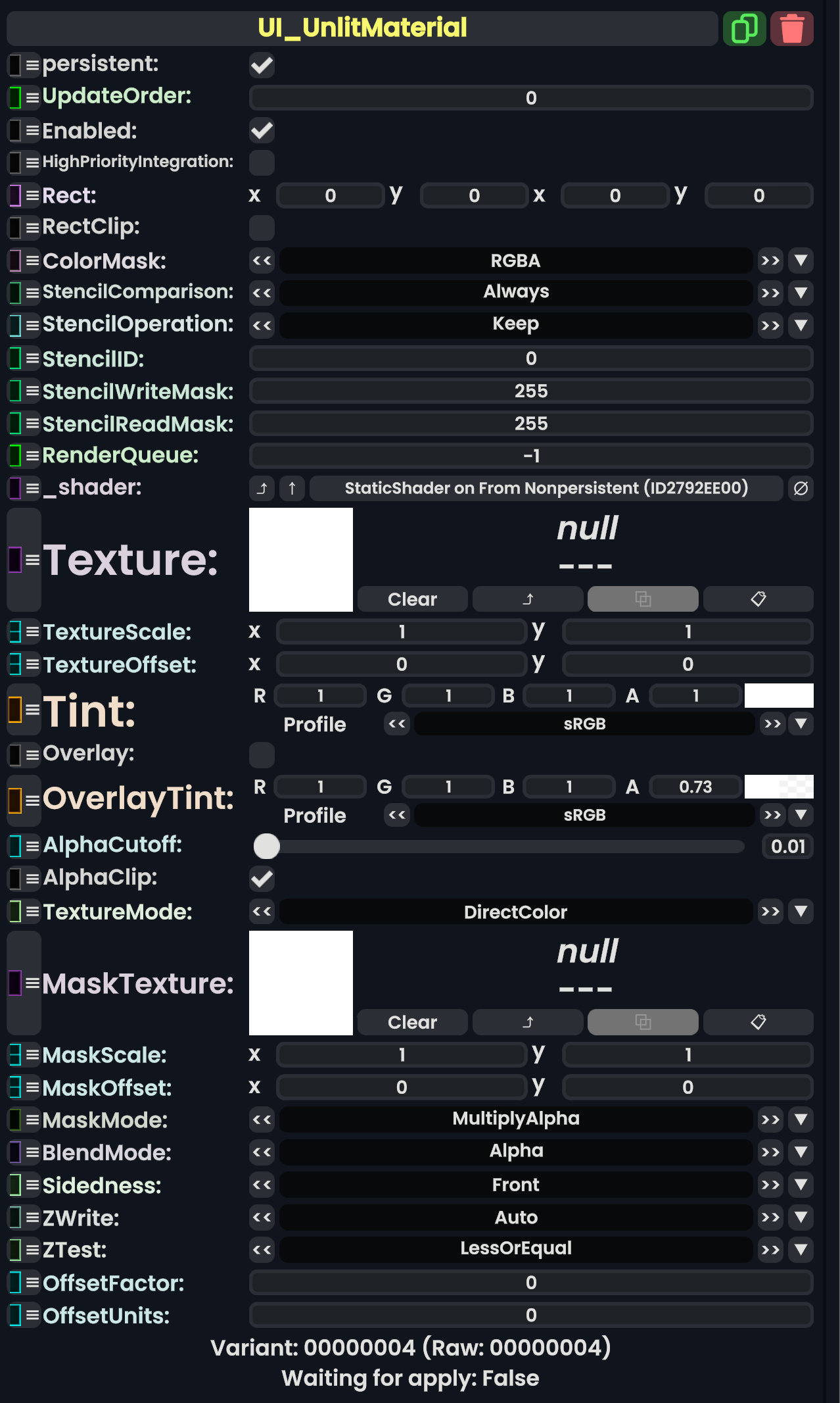 | 02:52, 12 February 2024 | UI UnlitMaterialComponent.png (file) | 384 KB | AmasterAmaster (talk | contribs) | Image that shows the "UI_UnlitMaterial" component. | 1 | |