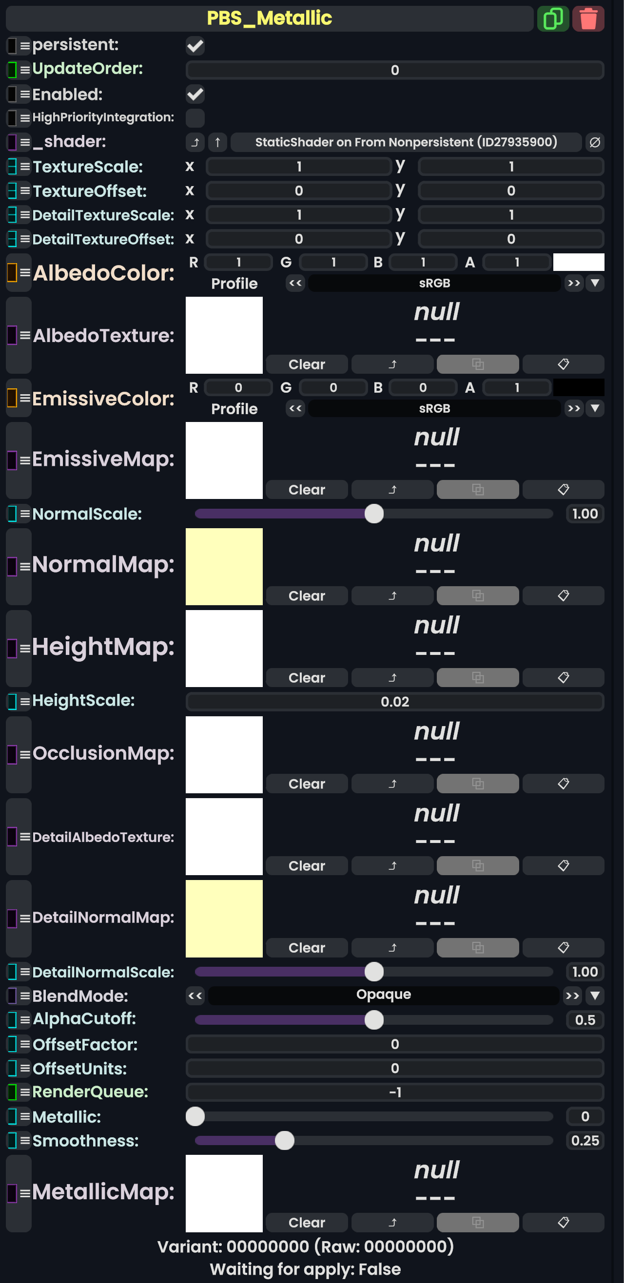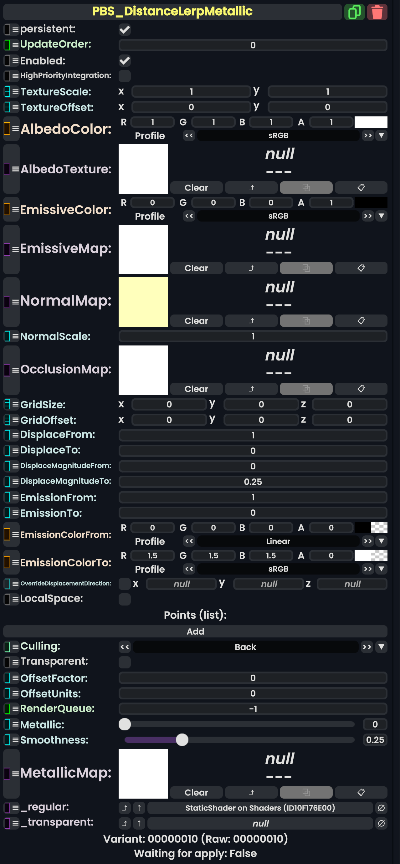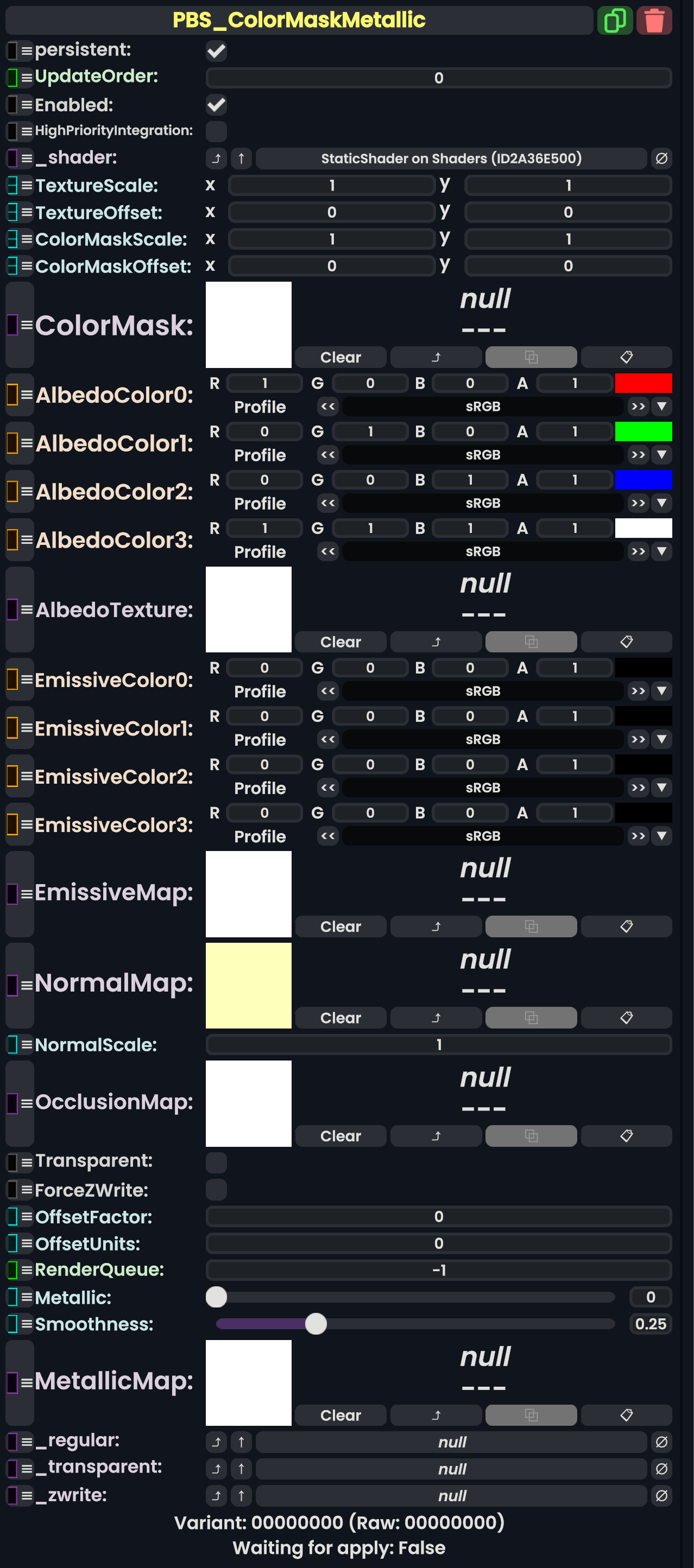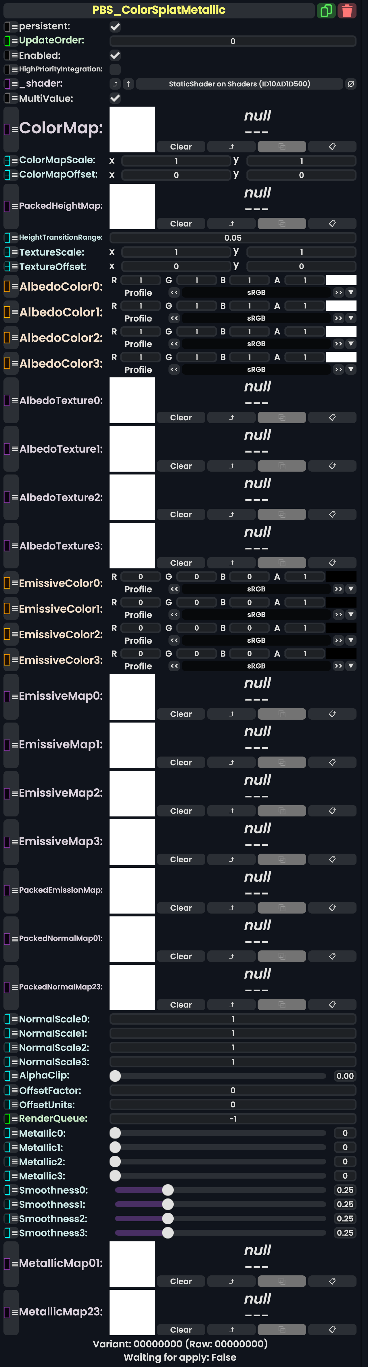 | 05:31, 12 February 2024 | PBS ColorSplatMetallicComponent.png (file) | 710 KB | AmasterAmaster (talk | contribs) | Image that shows the "PBS_ColorSplatMetallic" component. | 1 | |