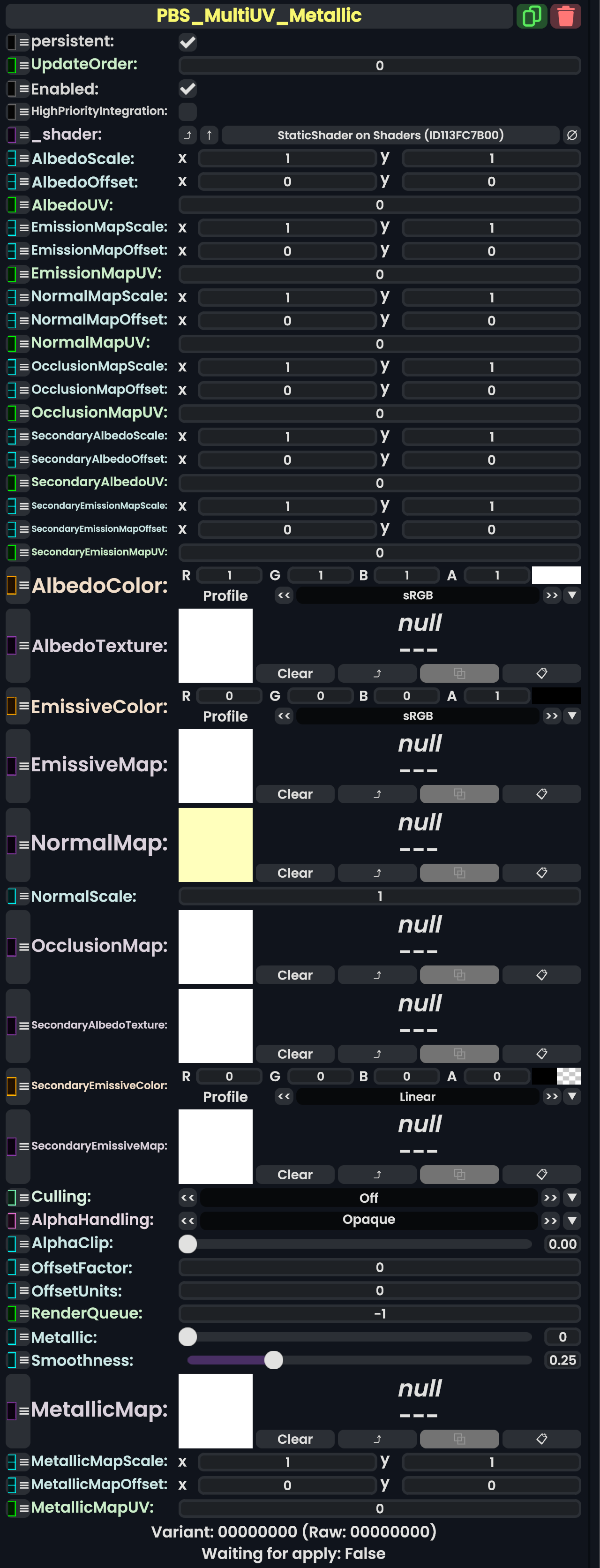 | 06:01, 12 February 2024 | PBS MultiUV MetallicComponent.png (file) | 564 KB | AmasterAmaster (talk | contribs) | Image that shows the "PBS_MultiUV_Metallic" component. | 1 | |