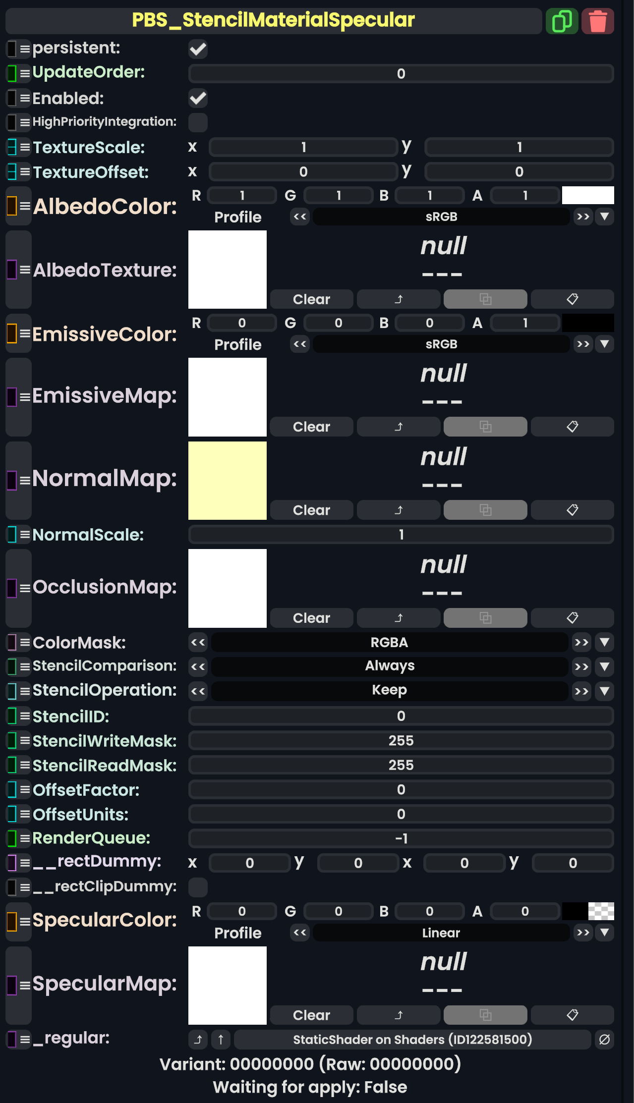 | 06:13, 12 February 2024 | PBS StencilMaterialSpecularComponent.png (file) | 370 KB | AmasterAmaster (talk | contribs) | Image that shows the "PBS_StencilMaterialSpecular" component. | 1 | |